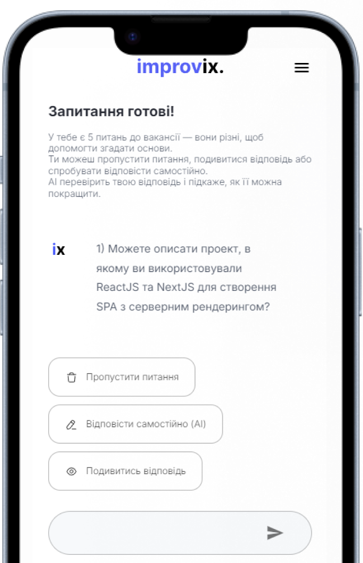 Обери готову відповідь або напиши свою. Ми покажемо, що варто додати чи виправити, щоб звучати впевнено і професійно.